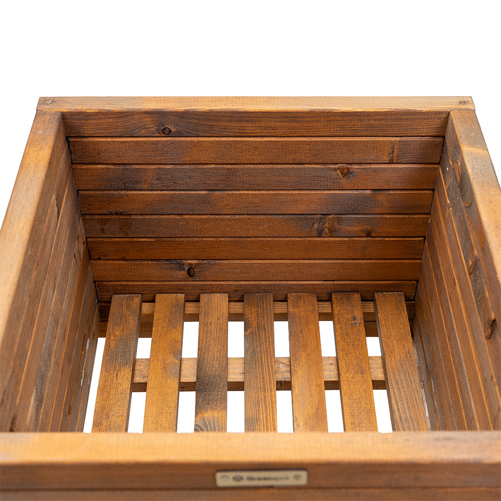 Dno donicy zaprojektowane zostało tak, aby umożliwić swobodny przepływ powietrza i skuteczny odpływ nadmiaru wody. W zestawie znajduje się wysokiej jakości agrowłóknina o gramaturze 100 g, która zapobiega bezpośredniemu kontaktowi gleby z drewnem, jednocześnie pomagając w utrzymaniu odpowiedniej wilgotności podłoża. Dzięki temu korzenie roślin mają zapewnione optymalne warunki do wzrostu.