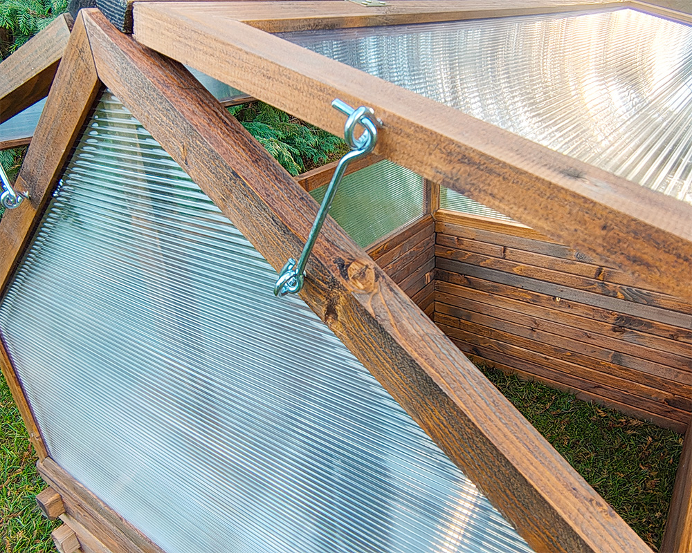 Szklarnia Timber wykonana jest z selekcjonowanego drewna świerkowego oraz wysokiej jakości poliwęglanu komorowego, gdzie każdy element drewniany został poddany zanurzeniu w wysokiej jakości impregnacie żywicznym, przez co szklarnia jest odporna na zmienne warunki pogodowe i nie wymaga malowania nawet do 5 lat. Konstrukcja jest bardzo wytrzymała i stabilna, a poliwęglan bardzo elastyczny, dlatego nie trzeba obawiać się ekspozycji zewnętrznej, nawet przy ciężkich warunkach pogodowych. Dzięki temu mini szklarnia ogrodowa Timber doskonale sprawdza się przez cały rok, chroniąc rośliny przed chłodem, silnym wiatrem czy intensywnym
